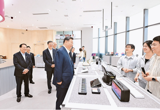 2025年4月29日,中共中央总书记、国家主席、中央军委主席习近平在上海考察。这是习近平在位于徐汇区的上海“模速空间”大模型创新生态社区人工智能产品体验店考察。新华社记者 谢环驰/摄