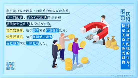 《条例》第九十四条第二款规定,利用职权或者职务上的影响为他人谋取利益,本人的配偶、子女及其配偶等亲属和其他特定关系人收受对方财物,情节较重的,给予警告或者严重警告处分;情节严重的,给予撤销党内职务、留党察看或者开除党籍处分。