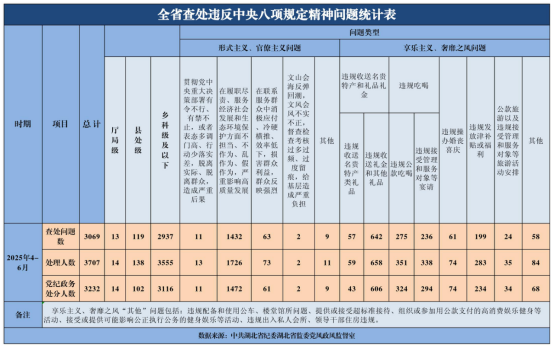 2025年第二季度,全省查处违反中央八项规定精神问题3069起,批评教育和处理3707人,其中,党纪政务处分3232人。